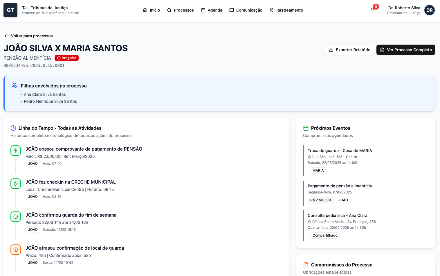 Ministério Público, Judiciário e assistentes sociais podem acessar o histórico de forma transparente, agilizando processos e reduzindo litígios.